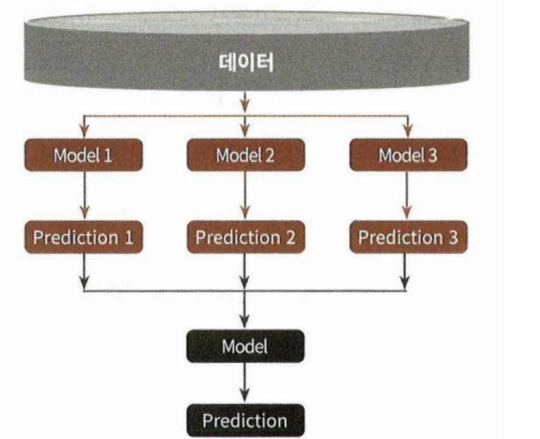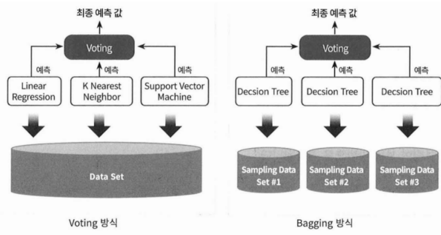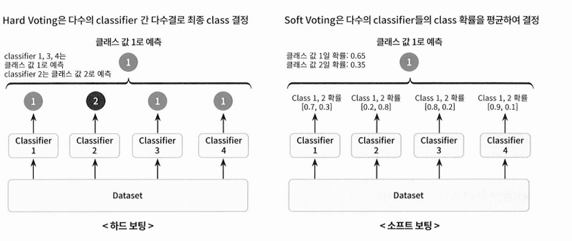 - 보팅 : 서로 다른 알고리즘을 가진 분류기들이 같은 데이터 세트를 학습